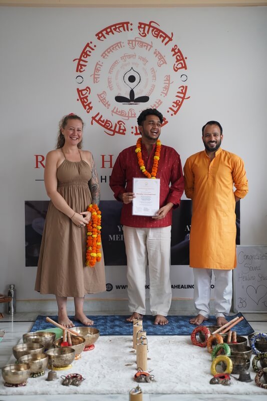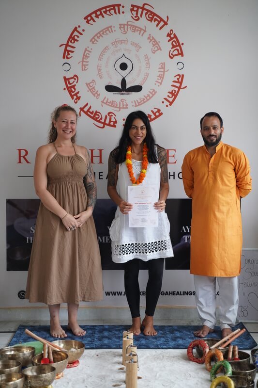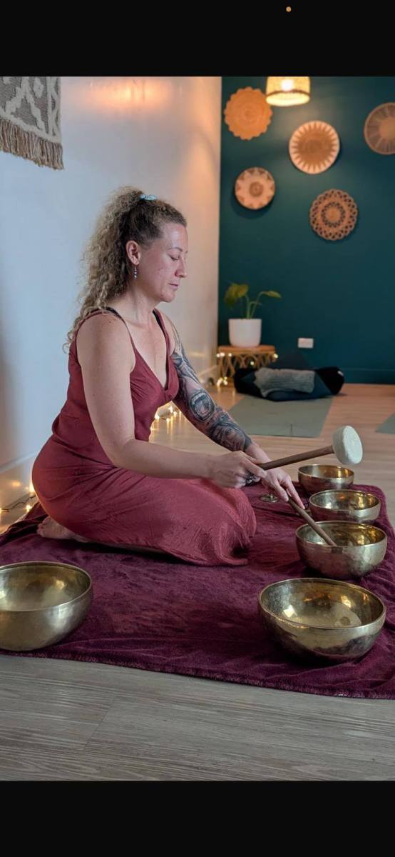 I have completed over 550 hours of certified yoga training in Rishikesh, India the yoga capital of the world where I deepened my knowledge of both traditional and modern practices. Alongside my yoga studies, I have also trained in sound healing, completing two specialized courses that allow me to integrate the power of sound into my offerings.